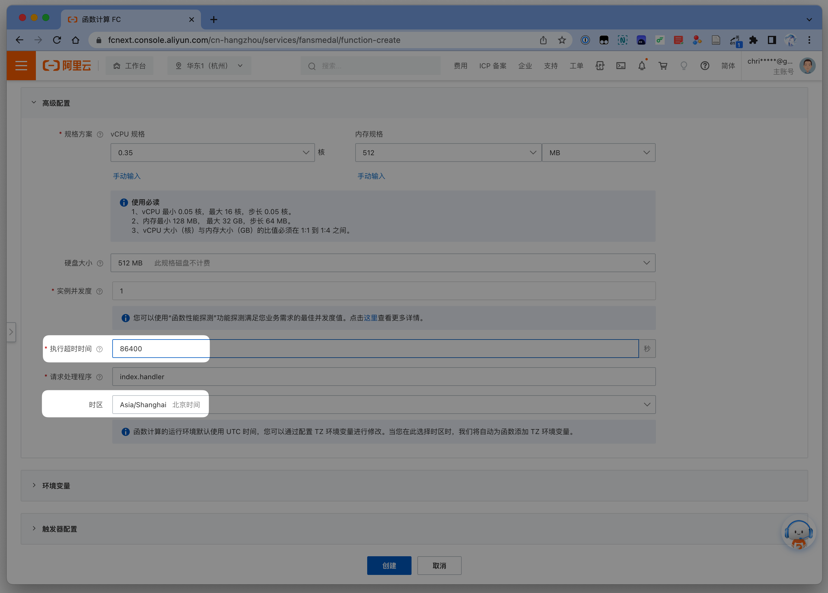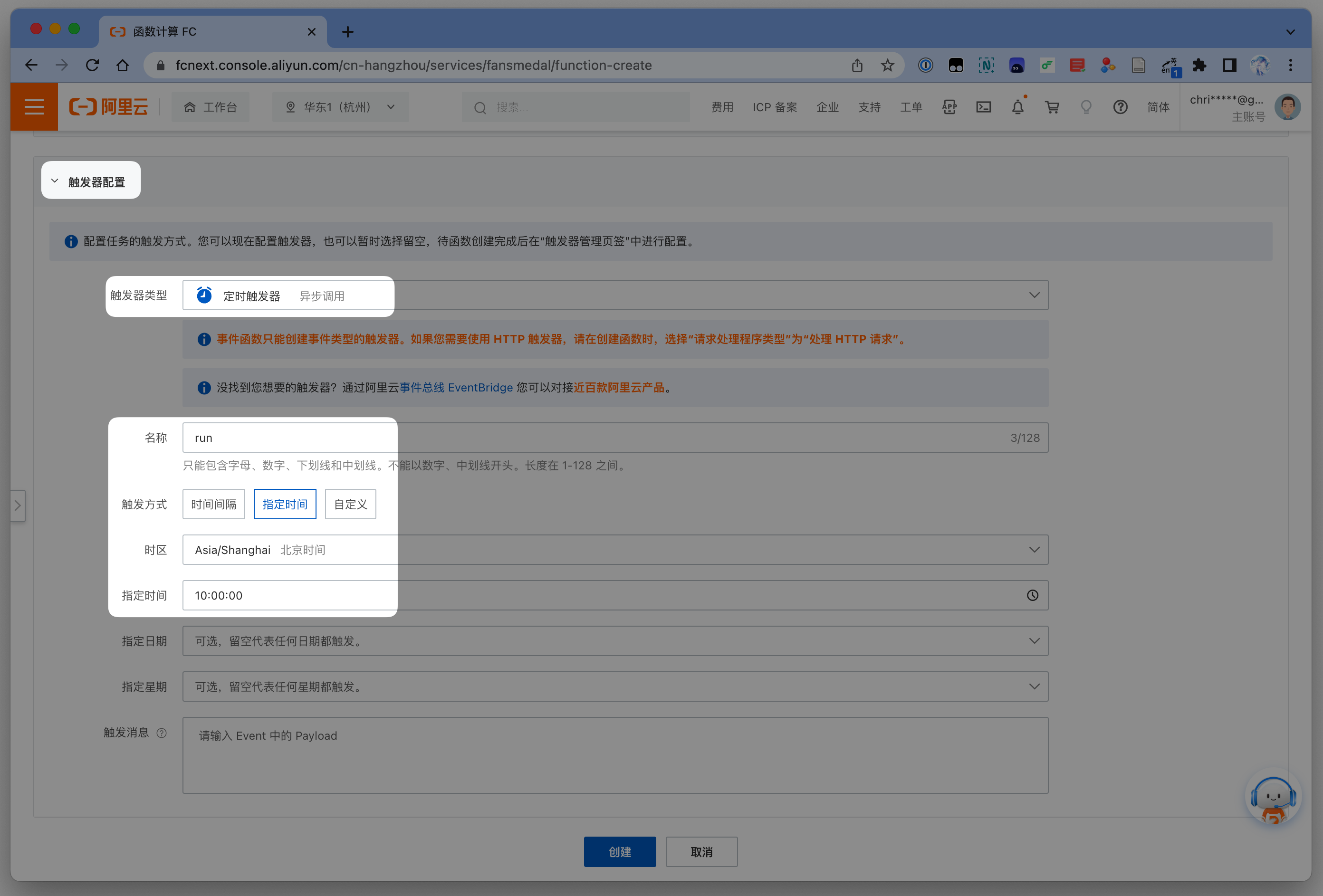 展开 触发器配置,类型选择 定时触发器,名称随便填,触发方式选择 指定时间,指定时间填你想脚本每天开始执行的时间,下面的不用填,点击 创建。