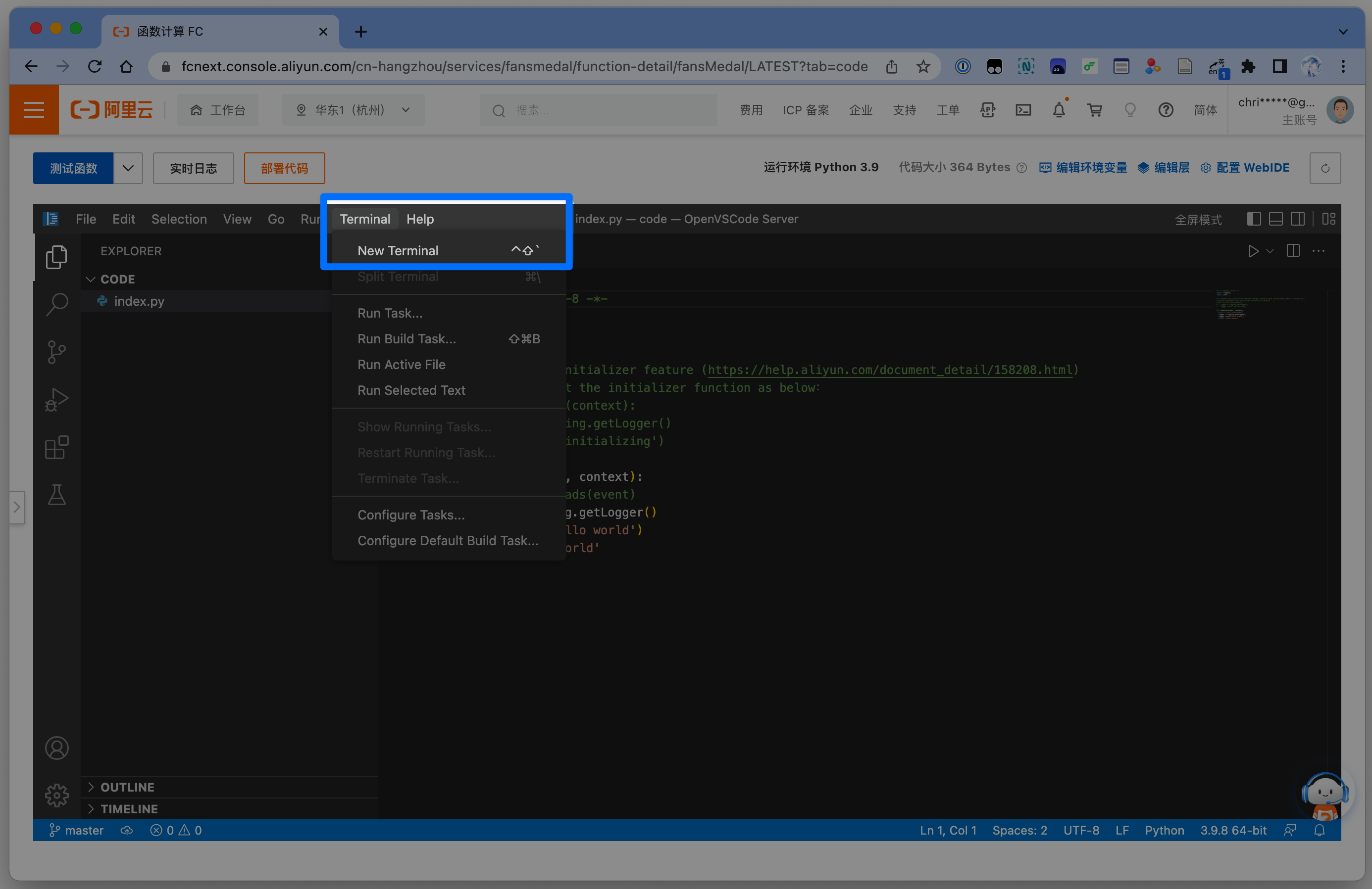 回到 函数代码 页面,在页面下方 终端中按顺序输入或粘贴以下代码。