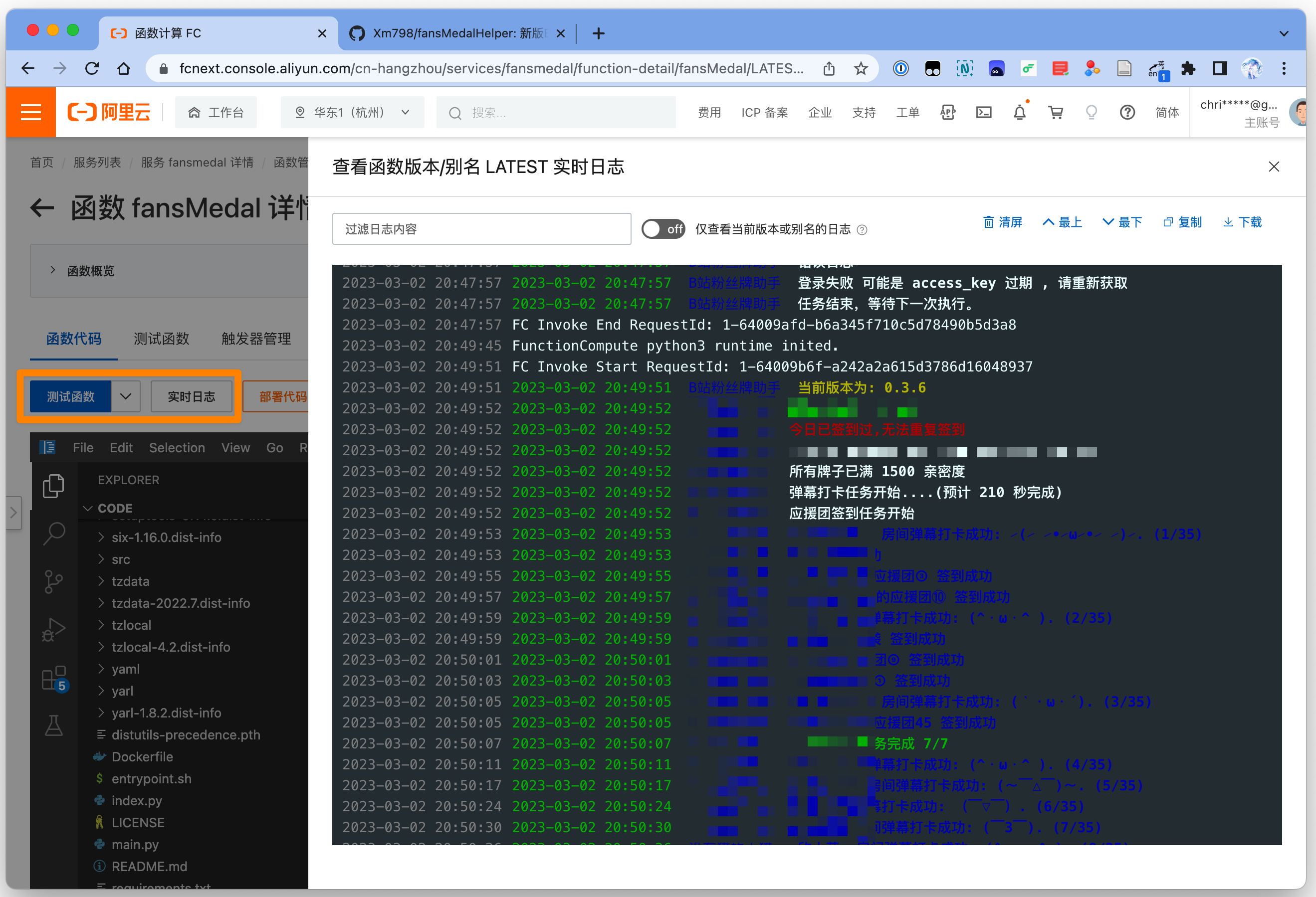 部署完毕后,点击左上角 测试函数 ,之后点击 实时日志,查看右边日志是否运行正常或者报错,耐心等待运行结束。